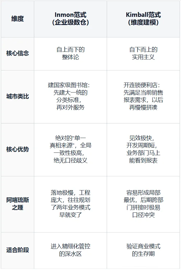 成熟企业的最优解: 多数大型企业最终走向融合路线——用Inmon的思想做顶层概念模型和数据标准(先画全市总规划),用Kimball的方法快速交付各部门的分析主题(各区按需建设)。