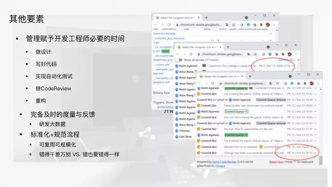 除了上面提到的流程与工具平台,负责技术管理的人员也要赋予开发工程师必要的时间去做好设计,写好代码、实现自动化测试,做好