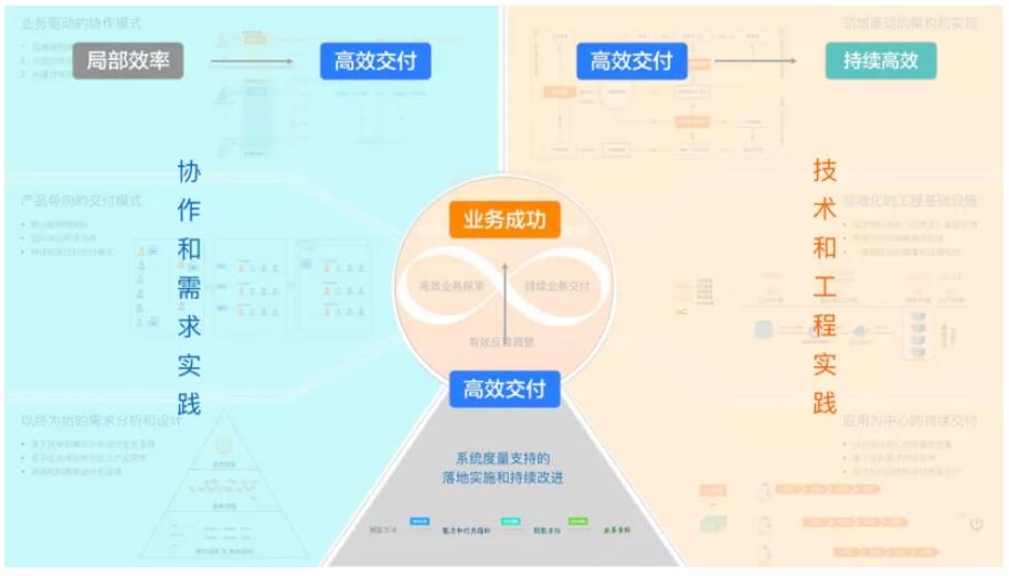 左侧是协作和需求实践。左上方我们称之为业务驱动需求的协作模式和产品导向的交互模式,下边是以终为始的需求分析和设计。左侧这部分实践解决的是局部效率如何带来高效的交付。