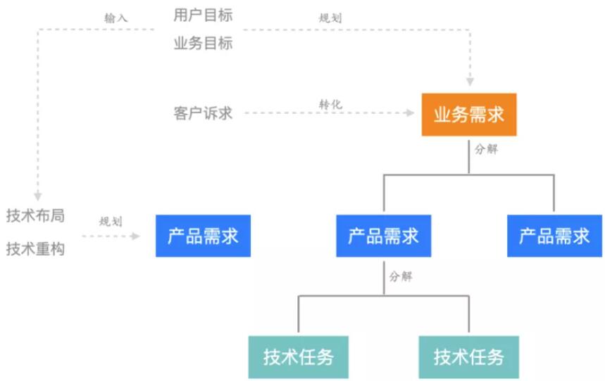 业务需求的实现需要落地到产品中,它会被分解为一个个的产品需求。产品需求会进一步被分解为技术任务,通过实现技术任务来交付产品需求,最终实现对应的业务需求。