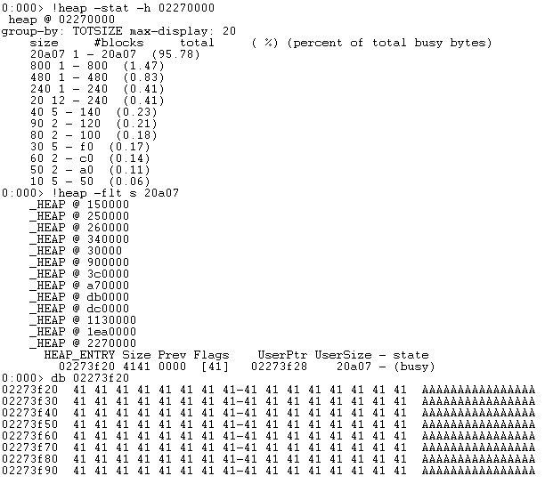 xp sp3下运行然后尝试我在这里提供的例子来帮助你抓住这个技术的知识要点。我已经决定不提供这个的源代码这样人们必须做一些你想工作来寻找正确堆栈布局然后达到命令执行。作为一个提示(希望不是很透),这里有一张'PoC'通过确定堆布局工作的截图