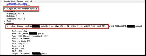 大部分DNS UPDATE请求流量来自于内部IP地址。上面是一个DNS UPDATE请求的例子,正在尝试更新我DNS服务器的区域,目的是为了更新一个SRV记录,包含一个LDAP服务器,它属于危地马拉的一个随机的政府网络。