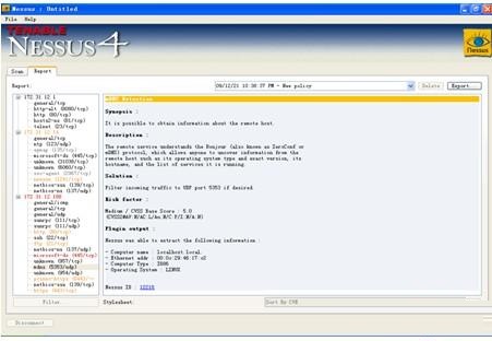 Nessus是一个功能强大而又易于使用的远程安全扫描器。安全扫描器的功能是对指定网络进行安全检查,找出该网络是否存在有导致对手攻击的安全漏洞。该系统被设计为client/sever模式,服务器端负责进行安全检查,客户端用来配置管理服务器端。在服务端还采用了plug-in的体系,允许用户加入执行特定功能的插件,这插件可以进行更快速和更复杂的安全检查。在Nessus中还采用了一个共享的信息接口,称之知识库,其中保存了前面进行检查的结果。检查的结果可以HTML、纯文本、LaTeX(一种文本文件格式)等几种格式保存。