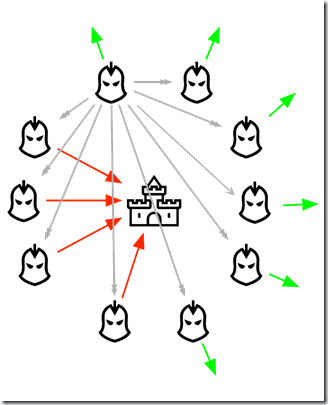 拜占庭帝国想要进攻一个强大的敌人,为此派出了10支军队去包围这个敌人。这个敌人虽不比拜占庭帝国,但也足以抵御5支常规拜占庭军队的同时袭击。基于一些原因,这10支军队不能集合在一起单点突破,必须在分开的包围状态下同时攻击。他们任一支军队单独进攻都毫无胜算,除非有至少6支军队同时袭击才能攻下敌国。他们分散在敌国的四周,依靠通信兵相互通信来协商进攻意向及进攻时间。困扰这些将军的问题是,他们不确定他们中是否有叛徒,叛徒可能擅自变更进攻意向或者进攻时间。在这种状态下,拜占庭将军们能否找到一种分布式的协议来让他们能够远程协商,从而赢取战斗?这就是著名的拜占庭将军问题。