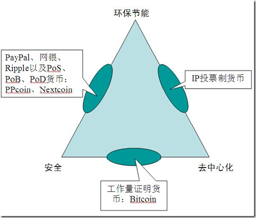 有人仿照CAP不可能三角,也提出了区块链共识的不可能三角:环保节能、安全、去中心化,三者不可能同时满足,必有一方的弱化。设计一个既环保又安全的密码学货币,它必然是中心化的,比如PPcoin、Nextcoin、Ripple,它们要么本身就是中心化的架构,要么其去中心化的架构不可维持,它们本质上仍是PayPal、网银一样的中心化验证机制;设计一个既环保又去中心化的密码学货币,它必然是不安全的,比如IP投票制的P2P货币,中本聪起初就已排除了这种可能,他认为“如果决定大多数的方式是基于IP地址的,一IP地址一票,那么如果有人拥有分配大量IP地址的权力,比如僵尸网络,就有可能主宰比特币网络”[vi]。设计一个安全的去中心化货币,它必然是以付出能源与计算力为代价。
