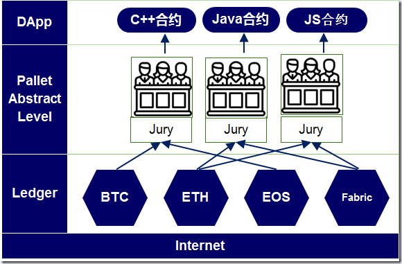 PalletOne提供了对各个底层链的抽象,用户使用常用的开发语言,基于对底层链的抽象接口进行操作。而合约的执行就是靠一个个的陪审团来完成的。