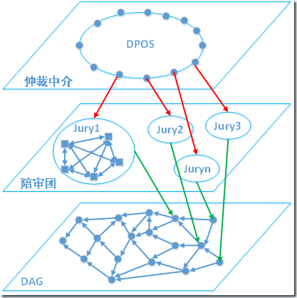 陪审团共识与传统POW、POS等共识的不同之处在于,陪审团共识是一个并行的共识机制,在同一个时刻,有多个陪审团同时在执行不同的合约。为了配合陪审团的并行共识,PalletOne采用了DAG作为分布式存储,合约的状态数据可以并行写入DAG中。所以PalletOne使用陪审团并行共识+DAG的并行写入,可以实现极高的TPS。
