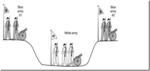 白军驻扎在沟渠里,蓝军则分散在沟渠两边。白军比任何一支蓝军都更为强大,但是蓝军若能同时合力进攻则能够打败白军。他们不能够远程的沟通,只能派遣通信兵穿过沟渠去通知对方蓝军协商进攻时间。是否存在一个能使蓝军必胜的通信协议,这就是两军问题。