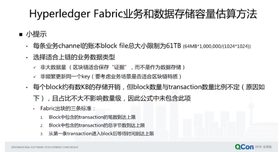 第二个就是我们要注意到底什么东西是适合放在区块链的,这不仅仅是容量规划的问题,而是整个业务场景选择的问题,因为首先区块链的特征是适合保存证据,它不是用来作为原始的数据存储,或大数据存储的基础设施。另外的话,如果你的业务场景,频繁地去更新同一个
