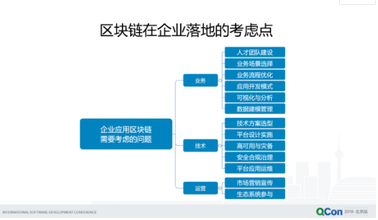对一个企业来说,要应用区块链到底需要考虑哪些维度的问题?大概分为这几个类别。比如说在业务方面,我们首先要做一件事是要有“人”的保证,这个人才的团队包含很多方面,需要区块链的技术人才,需要部署区块链底层,或者业务底层的云平台的技术人才,需要有业务应用开发的团队去支持,需要有业务方面的一些专家,所以这是人才团队的维度。