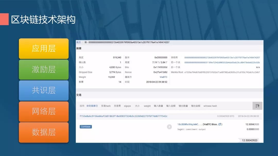 最核心的是交易的生成,上图所示是实际的一个区块的产生过程,每个区块都有它的前一个区块,通过前一个区块的信息结合当时交易发生的时间戳以及随机数进行计算,求得一个小于目标难度值的数,通过其他节点认证,大家认可就生成一个新的区块哈希值,写到新的区块中。每一个区块都是这么产生的,在整个交易链条中环环相扣。因为每个区块中都包含上一个区块的信息,因此它可以从后往前追溯,同时不可篡改。