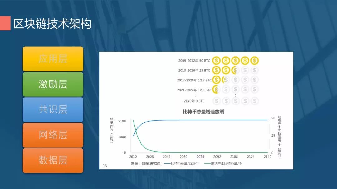 激励层就是发币的机制,前面提到任何一笔交易广播后,所有节点都会去争抢记账权,获得记账权完成记账后就会有奖励,比特币就是通过挖矿奖励产生。比特币的总量也不是无穷的,每四年减半。当比特币全部产生之后,矿工的收益就只有交易费,这也是比特币不会导致通胀的原因。