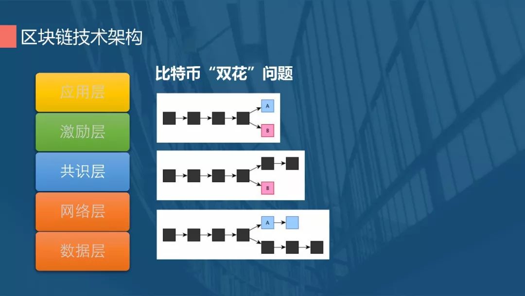 区块链里的机制是选择长的链,所以前面说到需要在5-6个区块后才能确认交易可靠,节点根据这个长的链同步数据,短的链就被撤销掉了,以此来共同来维护这个账本。解决这个问题我们需要在确认的时候有一个延时的机制,也就是说当延时一定程度之后再确认,使得它在这个时间当中不可能快速地去创建一个更长的链来撤销这个交易,这是时间也是根据当前整个网络的算力来估计的。理论上有双花的可能,但实际上发生的概率非常低。