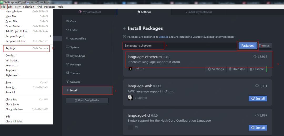 packages 到目标目录下,输入指令 apm install language-ethereum(language-ethereum是解压后的文件夹名),也可以到解压后文件夹下通过npm