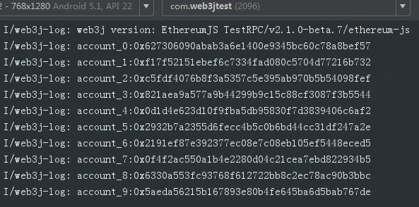 上面的函数执行完成后得到返回我们可以确认android通过web3j已成功和节点建立了关联,我们来获取一下账户信息