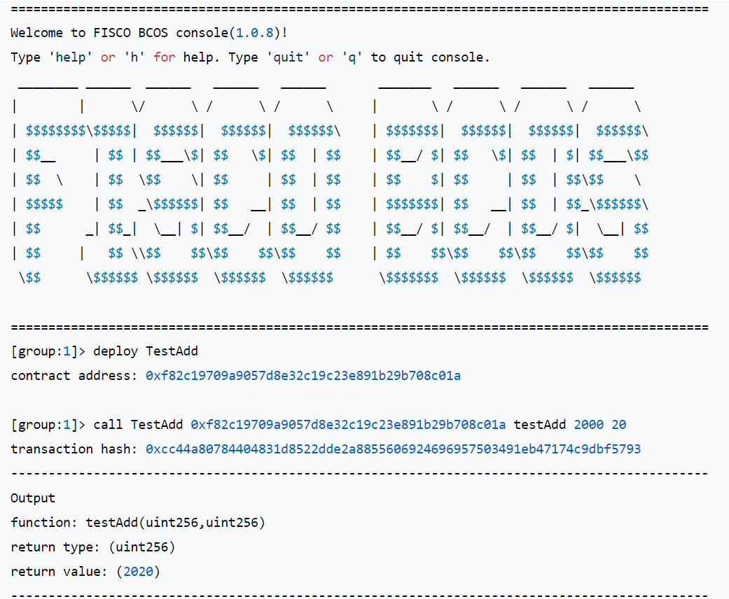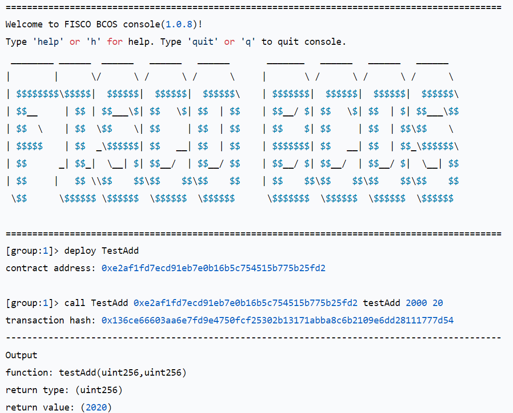 在 FISCO BCOS 控制台中,我们可以测试合约的结果(控制台的介绍文章详见 FISCO BCOS 控制台详解,飞一般的区块链体验),运行结果如下: