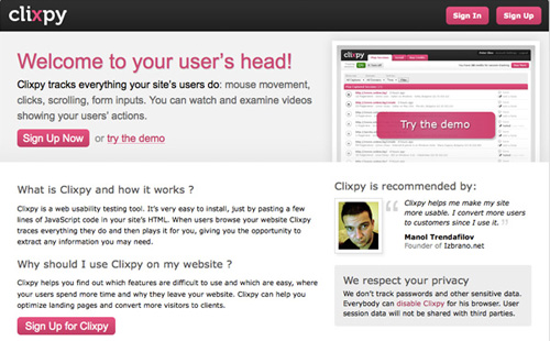 注册之后,把网站提供的一段Javascript代码加入到你的网站中即可,当用户访问网站的时候,一个小的附加文件会自动下载用于传输用户的点击事件。该产品提供免费试用版,可付费升级到不同的高级版本。