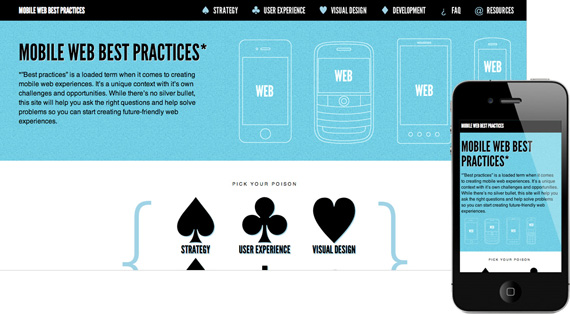 Mobile Web Best Practices的桌面版也显示了一个非常清晰明了的导航菜单。每个分类除了有相应的名称外,还会配上特定的图标。此外,在文本下面会有更清晰的分类图标。在移动设备上,顶部的文字菜单会消失,用户通过使用大的图标来对网站进行导航。该网站使用了两种不同风格的导航,尽管如此,分类清晰、风格与图标相一致,给用户带来了一定的视觉效果。 |
