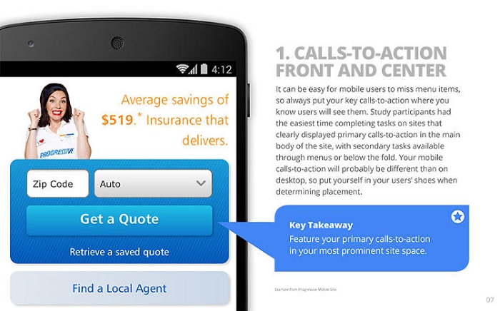 对于移动用户来说,往往很容易忘记菜单选项,因此,你应该把自己最关键的“行为召唤”内容放置在一个醒目的位置上,这样用户就能轻松看到。所以,你需要让最重要的“行为召唤”内容占据到网站的主体部分上,用户就能够快速完成相关任务,另外,如果要继续执行下一个任务,你可以利用菜单选项标明,也可以把下个任务紧跟在第一个任务完成之后。在移动端,你的“行为召唤”内容应该和桌面终端不一样,所以你必须要“对号入座”,因地制宜。
