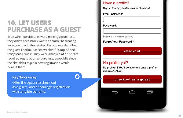 关键要素:你可以在移动网站上面提供一个选项,让用户能以访客的身份进行购物。另外,如果你需要用户在网站上注册一个账号,那么可以明确的告诉他们注册账号会有什么好处。