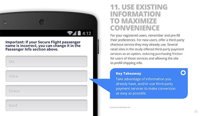 对于那些网站注册用户而言,你需要记住他们的偏好。而对于新用户而言,你可以提供一个他们习惯使用的第三方支付服务。谷歌研究人员对一些零售网站进行了调研,他们发现许多网站都提供了第三方支付服务,避免了最后买单时的不便,另外移动网站还可以根据注册用户的已有信息,提供预填物流地址信息功能。