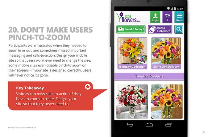 如果用户需要用手捏放屏幕,去放大或缩小图片时,有时会看不到一些重要信息或相关的“行为召唤”内容,这会让用户感到很失望。在设计网站的时候,你就应该注意到这一点,不要让用户去改变网站尺寸。有些网站会把捏放屏幕功能取消掉,如果你的网站设计的非常合理,用户根本不会注意到没有这个功能。