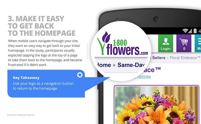当移动用户在你的网站上面导航浏览时,他们会希望可以快速回到之前的主页上面。谷歌公司在研究中发现,用户往往喜欢点击页面上的公司Logo,因为他们觉得这种方式可以直接回到主页上去,所以你的网站必须也要支持这个功能,否则如果用户点击了Logo,却毫无反应,他们肯定会觉得非常失望。