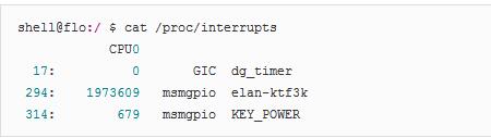因为 Nexus 7 使用了 ELAN 的触屏控制器,所以结果中的 elan-ktf3k 就是触屏的中断请求信息,其中 294 是中断号,1973609 是触发的次数(手指单击时会产生两次中断,但滑动时会产生上百次中断)。
