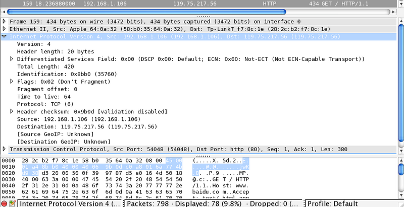 接下来如果继续介绍 IP 协议和 MAC 协议可能很多读者会晕,所以本节将使用 Wireshark 来通过具体例子讲解,以下是我请求百度首页时抓取到的网络数据: