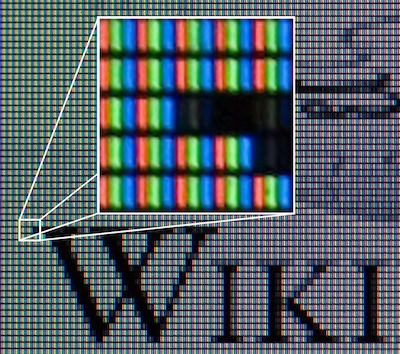 LCD 屏幕上的每个物理像素点实际上是由红、绿、蓝 3 种色彩的点组成,每个颜色点能单独控制,下面是用显微镜放大后的情况(来自 Wikipedia):