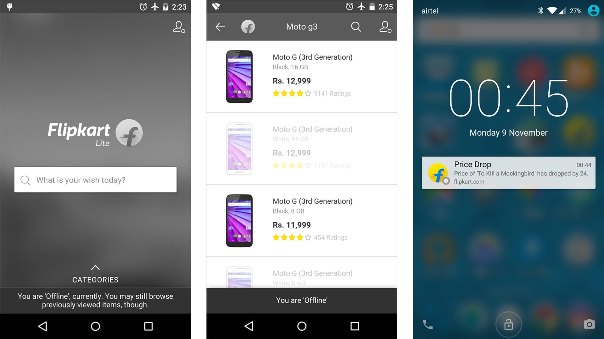 更强大的是,在无法访问网络时,Flipkart Lite 可以像原生应用一样照常执行,还会很骚气的变成黑白色;不但如此,曾经访问过的商品都会被缓存下来得以在离线时继续访问。在商品降价、促销等时刻,Flipkart