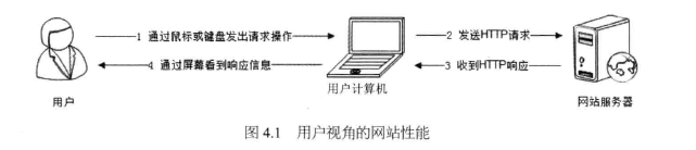 用户视角的网站性能:从用户角度,网站性能就是用户在浏览器上直观感受到的网站响应速度.用户的感受时间包括用户计算机和网站服务器通信的时间、网站服务器处理请求时间、用户计算机浏览器构造请求和解析响应数据的时间。