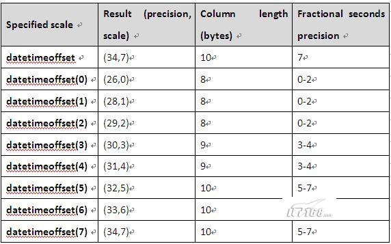 最后新的日期数据类型是DATETIMEOFFSET数据类型,此数据类型让你存储的日期和时间(24小时制)是时区一致的。时间部分能够支持如DATETIME2和TIME数据类型那样的高达100纳秒的精度。DATETIMEOFFSET需要8到10字节的磁盘空间开销,这完全取决于你定义的时间部分的精度,如下表所示: