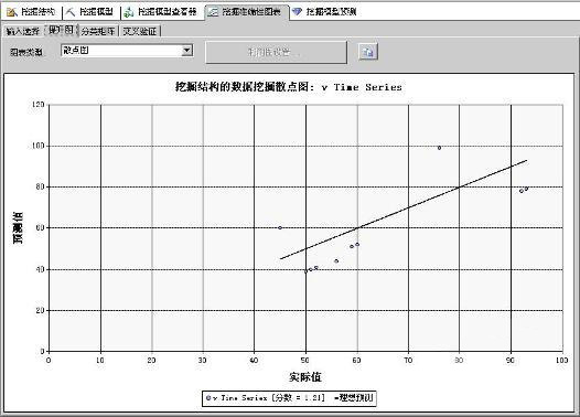 如果模型包含可预测连续性的属性,系统会自动显示散点图。所谓散点图,就是通过图形对照显示模型中的实际值和预测值。X轴表示实际值,Y轴表示预测值,图中间的一条直线表示在完美预测的情况下,预测值和实际值完全匹配。散点图通过将连续性的输入属性视为独立变量,预测属性视为依赖变量,图形显示了结果与输出的紧密程度。如图3所示。