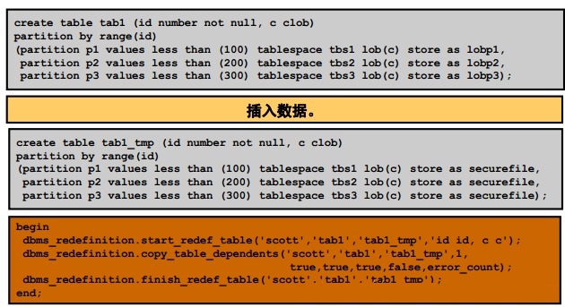 最后一部分演示了如何使用DBMS_REDEFINITION过程通过先前创建的临时表重新定义表。