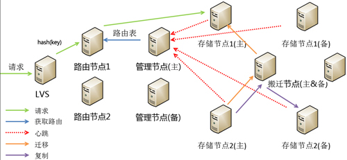 为提高系统的可用性,除路由节点外的所有节点均采用一主一备的形式。路由节点为无状态节点,可以同时存在多个节点,可以在路由节点前加一个LVS模块做负载均衡和容错。系统整体架构如图2所示。