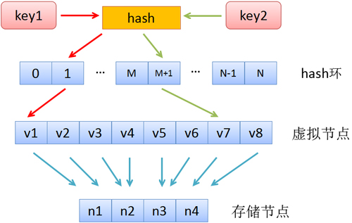 增加虚拟节点后,key和存储节点映射关系也由原来的key→hash环→存储节点转换成了key→hash环→虚拟节点→存储节点。映射关系如图3所示。