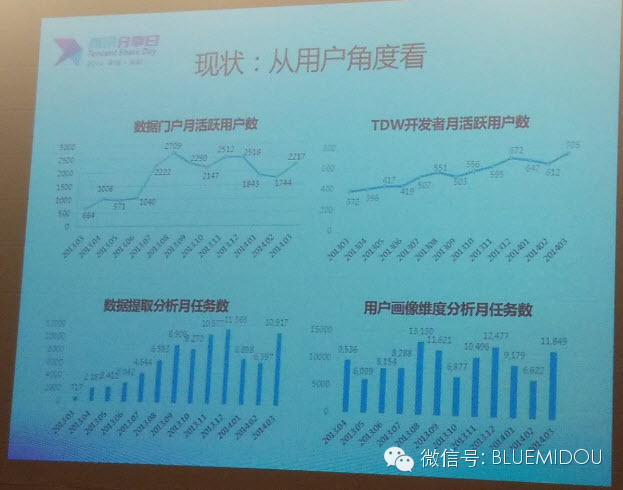 这里的用户,指的是腾讯内部员工。腾讯员工2万多人,腾讯数据门户的月活跃是2500左右,也就是说访问腾讯数据门户的人占比公司10%+;每月处理数据提取分析的任务数是1万个,如果访问者每人都会提数据任务,平均就是一个人提4个左右的分析提取任务;用户画像分析任务为1.2万,可以看出腾讯对用户画像的重视程度。