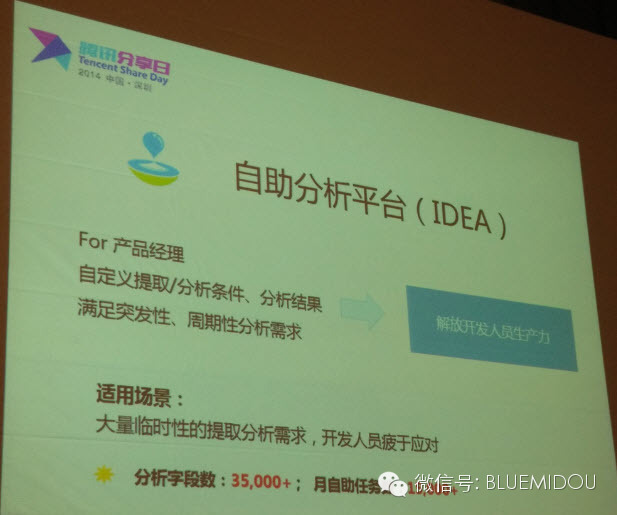 只看用户数量和产品数量,我们就不难猜测腾讯每天需要处理非常大的数据,而在这个首次对外开放的商业智能日上,通过腾讯的分享,我们了解了这个数据究竟有多大:从业务的角度,总记录达到375万亿条,日接入5千亿条,覆盖移动设备数7.7亿;从平台的角度,腾讯数据平台设备8400台,单集群5600台,总存储100PB+;日新增数据200TB+,月数据增长率10%,日均JOB数100万,日均计算量5PB。下面我们一起看BLUES的报道。