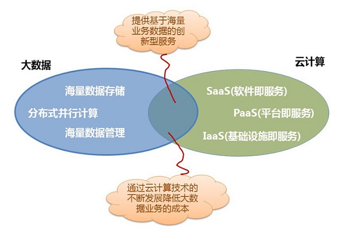 业内是这么形容两者的关系:没有大数据的信息积淀,则云计算的计算能力再强大,也难以找到用武之地;没有云计算的处理能力,则大数据的信息积淀再丰富,也终究只是镜花水月。