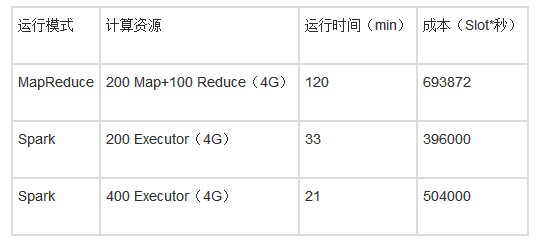 对比结果表的第一行和第二行,Spark运行效率和成本相对于MapReduce方式减少非常明显,其中,DAG模型减少了70%的HDFS读写、cache减少重复数据的读取,这两个优化即能减少作业运行时间又能降低成本;而资源调度次数的减少能提高作业的运行效率。