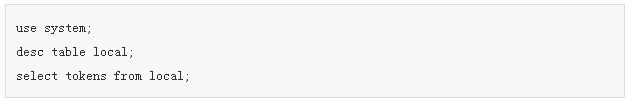 有关token range的信息存储在cassandra的system命名空间(keyspace)下的local和peers两张表中。其中local表示本节点的token range情况,而peers表示集群中其它节点的token range情况。这两张表中的tokens字段就存储有详细的信息。如果集群中只由一台机器组成,那么peers中的就会什么内容都没有。