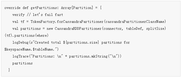 getPartitions函数会调用CassandraRDDPartitioner来获取分区数目: