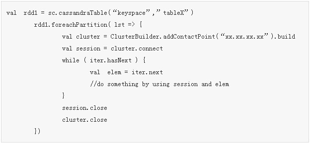 如果是直接使用Cassandra Java Driver,为了避免每个RDD中的iterator都需要打开一个session,那么可以使用foreachPartition函数来进行操作,减少打开的session数。