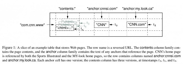 图1是Bigtable论文里给出的例子,Webtable表存储了大量的网页和相关信息。在Webtable,每一行存储一个网页,其反转的url作为行键,比如maps.google.com/index.html的数据存储在键为com.google.maps/index.html的行里,反转的原因是为了让同一个域名下的子域名网页能聚集在一起。图1中的列族"anchor"保存了该网页的引用站点(比如引用了CNN主页的站点),qualifier是引用站点的名称,而数据是链接文本;列族"contents"保存的是网页的内容,这个列族只有一个空列"contents:"。图1中"contents:"列下保存了网页的三个版本,我们可以用("com.cnn.www",