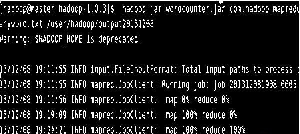 本组实验设置Hadoop块大小为16M默认情况下是64 M ) ,冗余备份参数设置为3(默认值),实验环境同实验一,程序运行5次,记录时间并计算平均值,运行日志如图7所示。