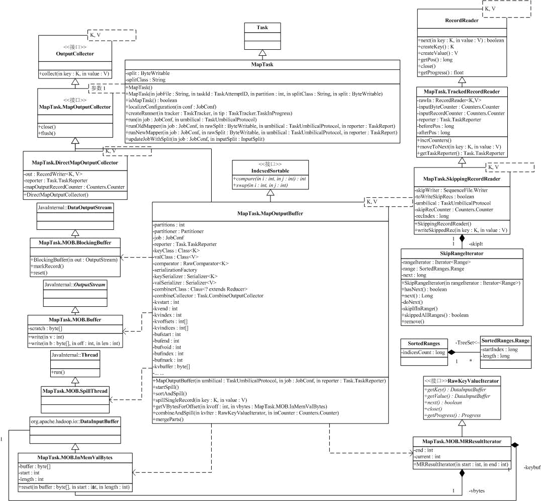 如果Mapper后续有reduce任务,系统会使用MapOutputBuffer做为输出,这是个比较复杂的类,有1k行左右的代码。