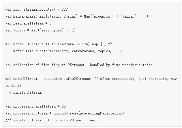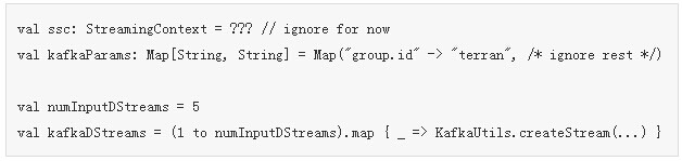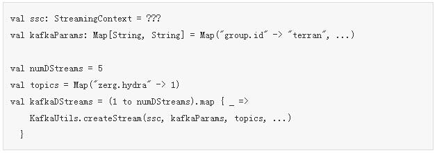 我们建立了5个input DStreams,它们每个都会运行一个消费者线程。如果“zerg.hydra”topic拥有5个分区(或者更少),那么这将是进行并行读取的最佳途径,如果你在意系统最大吞吐量的话。