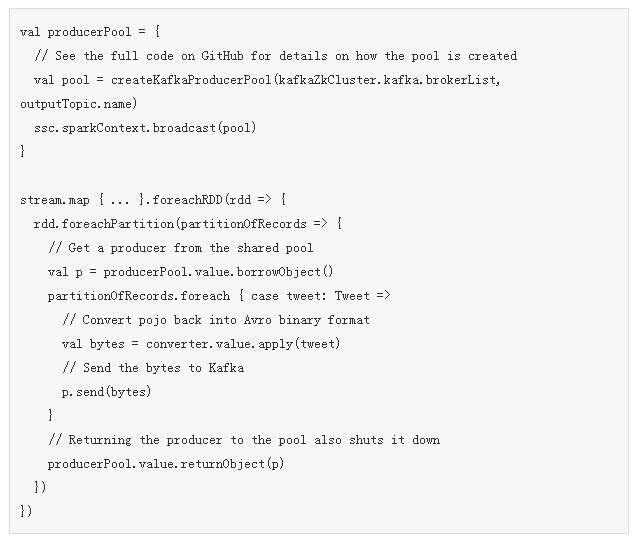 需要注意的是, Spark Streaming每分钟都会建立多个RDDs,每个都会包含多个分区,因此你无需为Kafka生产者实例建立新的Kafka生产者,更不用说每个Kafka消息。上面的步骤将最小化Kafka生产者实例的建立数量,同时也会最小化TCP连接的数量(通常由Kafka集群确定)。你可以使用这个池设置来精确地控制对流应用程序可用的Kafka生产者实例数量。如果存在疑惑,尽量用更少的。