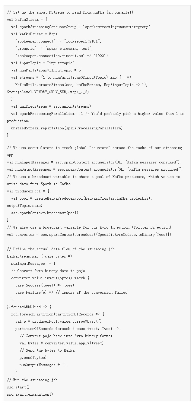 下面的代码是示例Spark Streaming应用程序的要旨(所有代码参见 这里)。这里,我做一些解释: